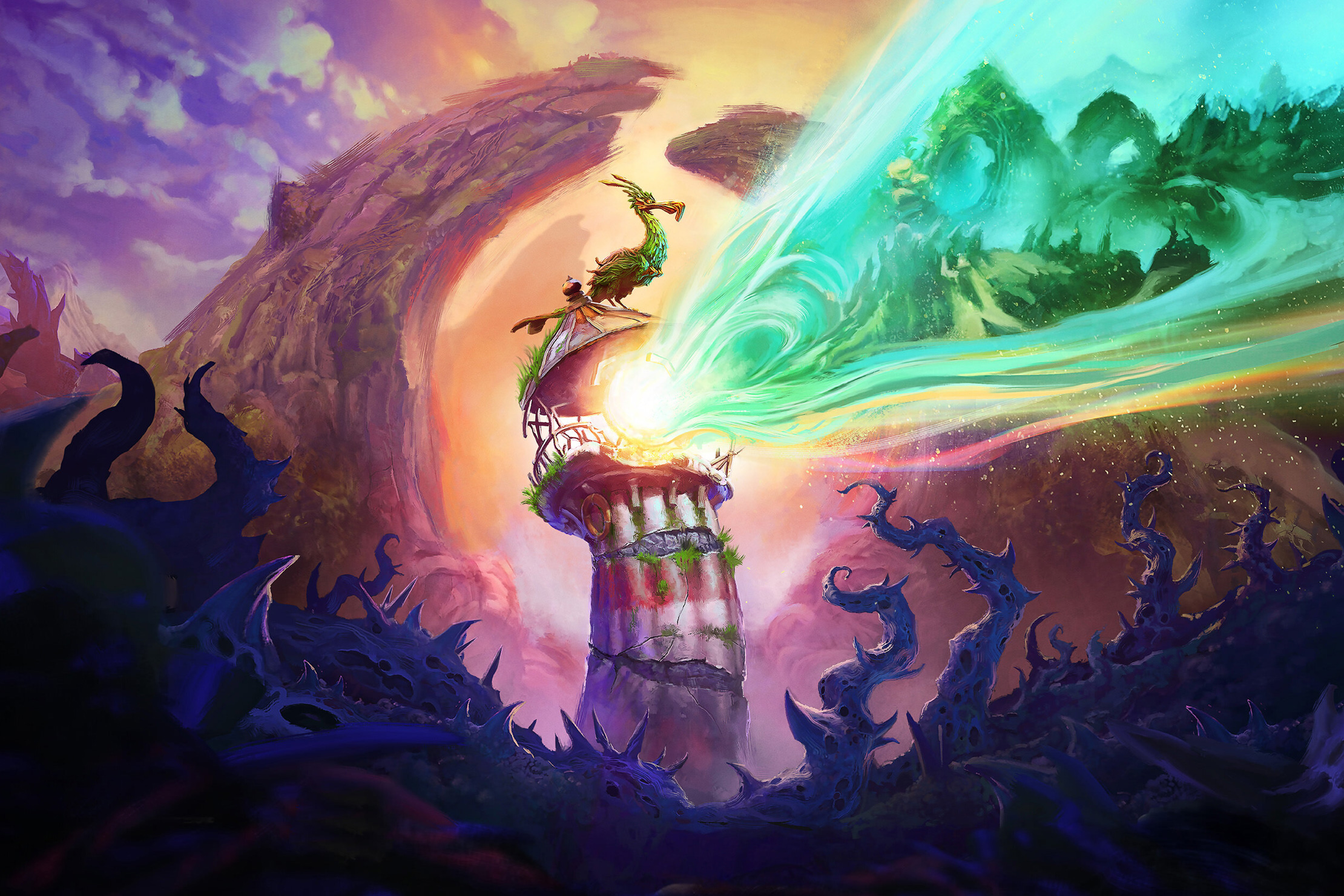Dans Keeper, on incarne donc un… phare. Oui oui, ces immenses structures guidant les bateaux ! Dès le début, le phare s’écroule. Mais dans le monde fantastique proposé ici, ce n’est qu’un nouveau départ. Des pattes viennent se greffer en dessous du phare et, après quelques pas chancelants, ce dernier trouve son équilibre. Comme ci cela n’était pas assez bizarre, le phare a pour compagnon un oiseau qu’il vient de sauver de mystérieux parasites volants. Les deux compères partent donc à l’aventure.