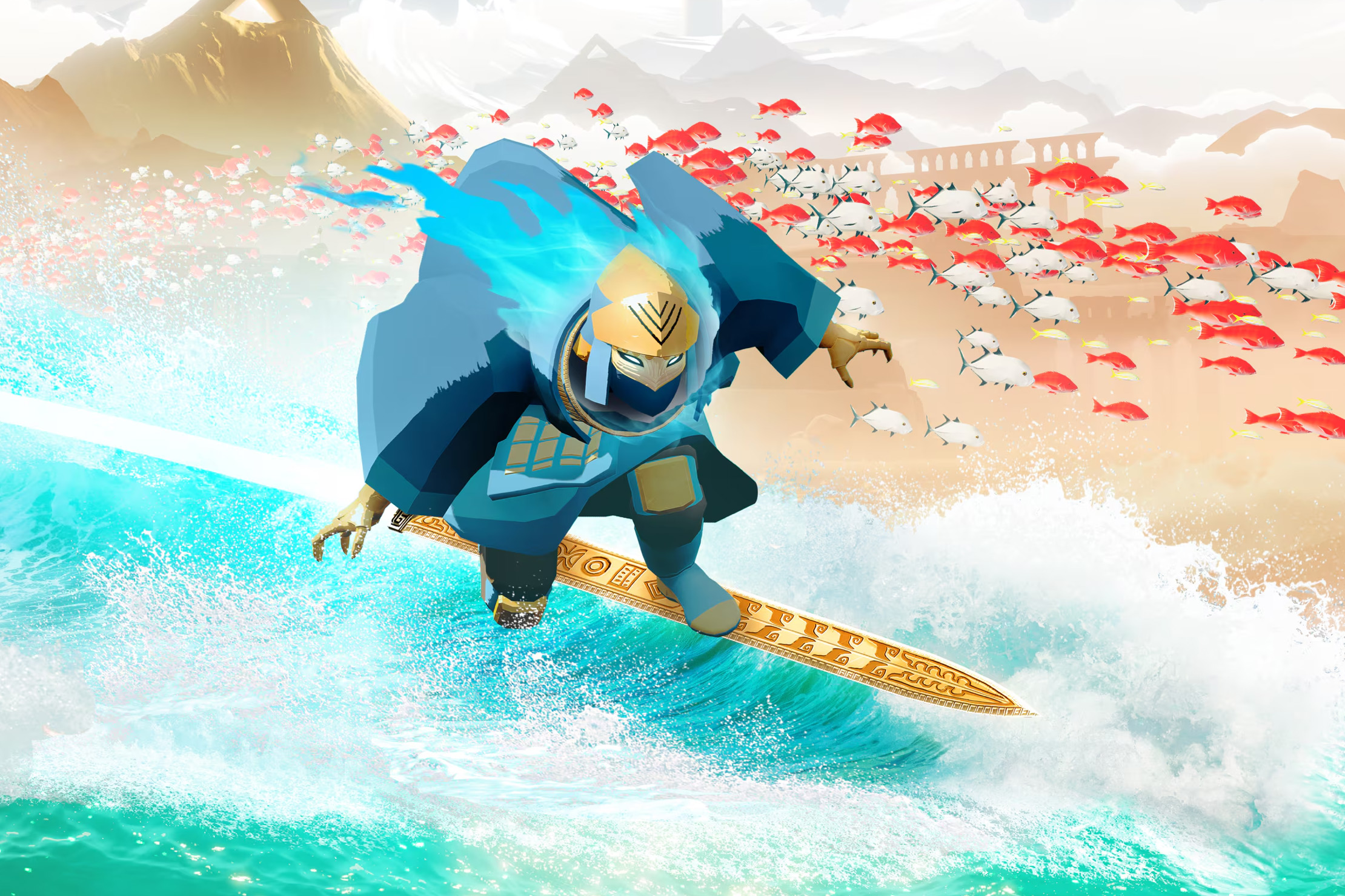 Dès le départ, les sensations de glisse sont excellentes, notre héros se déplace de façon fluide et la sensation de vitesse est bien présente. Profitant des vagues et de la verticalité des niveaux, on passe pas mal de temps dans les airs à enchaîner les tricks pour améliorer son score global. Au fil de notre progression, on peut collecter de la monnaie (de petites pyramides d’or) et l’échanger à un mystérieux marchand afin de débloquer de nouveaux tricks. Rien de très poussé en réalité, mais on se laisse prendre au jeu et on enchaîne les figures acrobatiques presque machinalement. Quelques petits challenges et phases de half-pipe sont également présents.